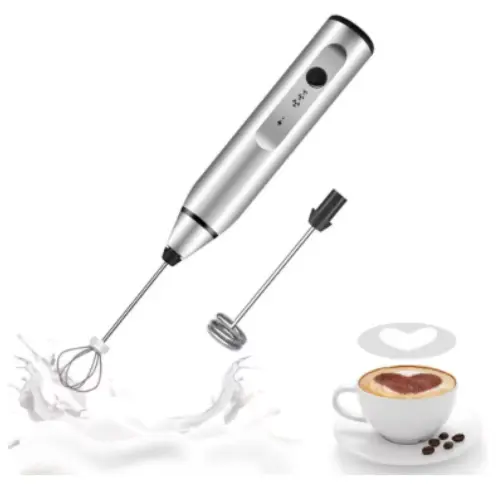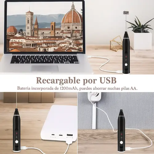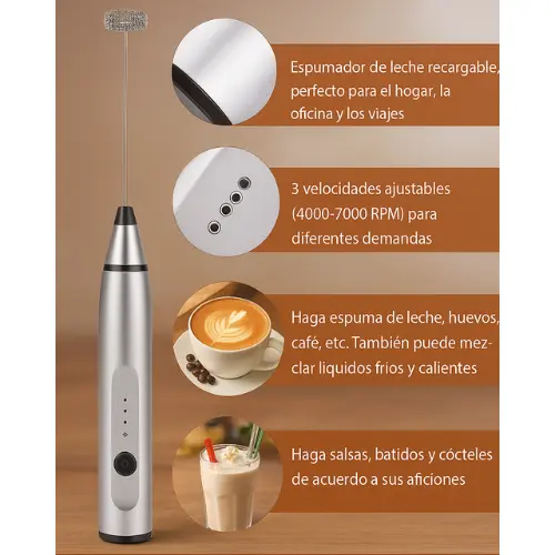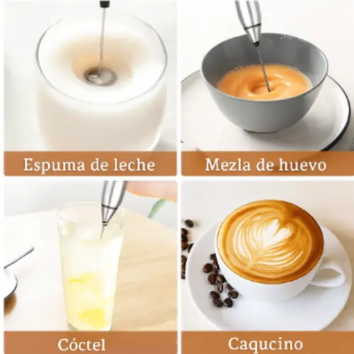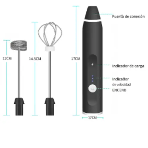 El batidor multifunción incluye cabezales de 12 cm (espumador) y 14,5 cm (batidor de globo), con una altura total de 17 cm. Su diseño ergonómico se adapta a tu mano y te permite un uso cómodo y eficiente.