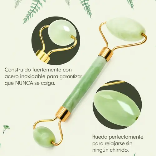 La piedra jade, completamente natural y rica en más de 30 oligoelementos beneficiosos, no daña ni irrita la piel. Su superficie lisa y fresca trabaja suavemente para ayudarte a reducir líneas finas, arrugas, poros abiertos e hinchazón